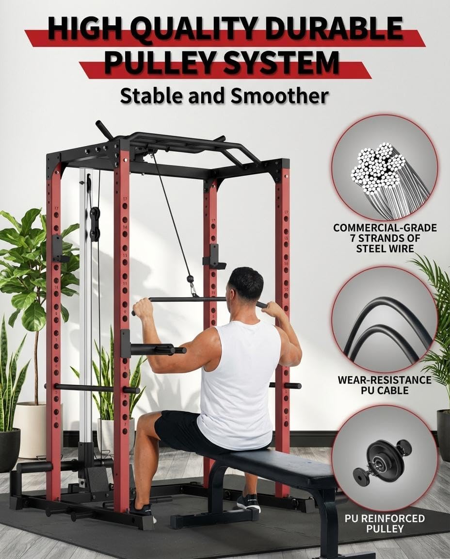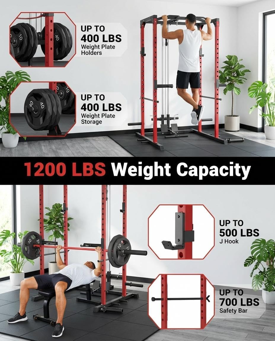 All-in-1 Power Cage with Pulley System, 1200LBS Multi-Functional Squat Rack for Home Gym, Weight Cage Includes LAT Pulldown, Dip Bars and More Attachments