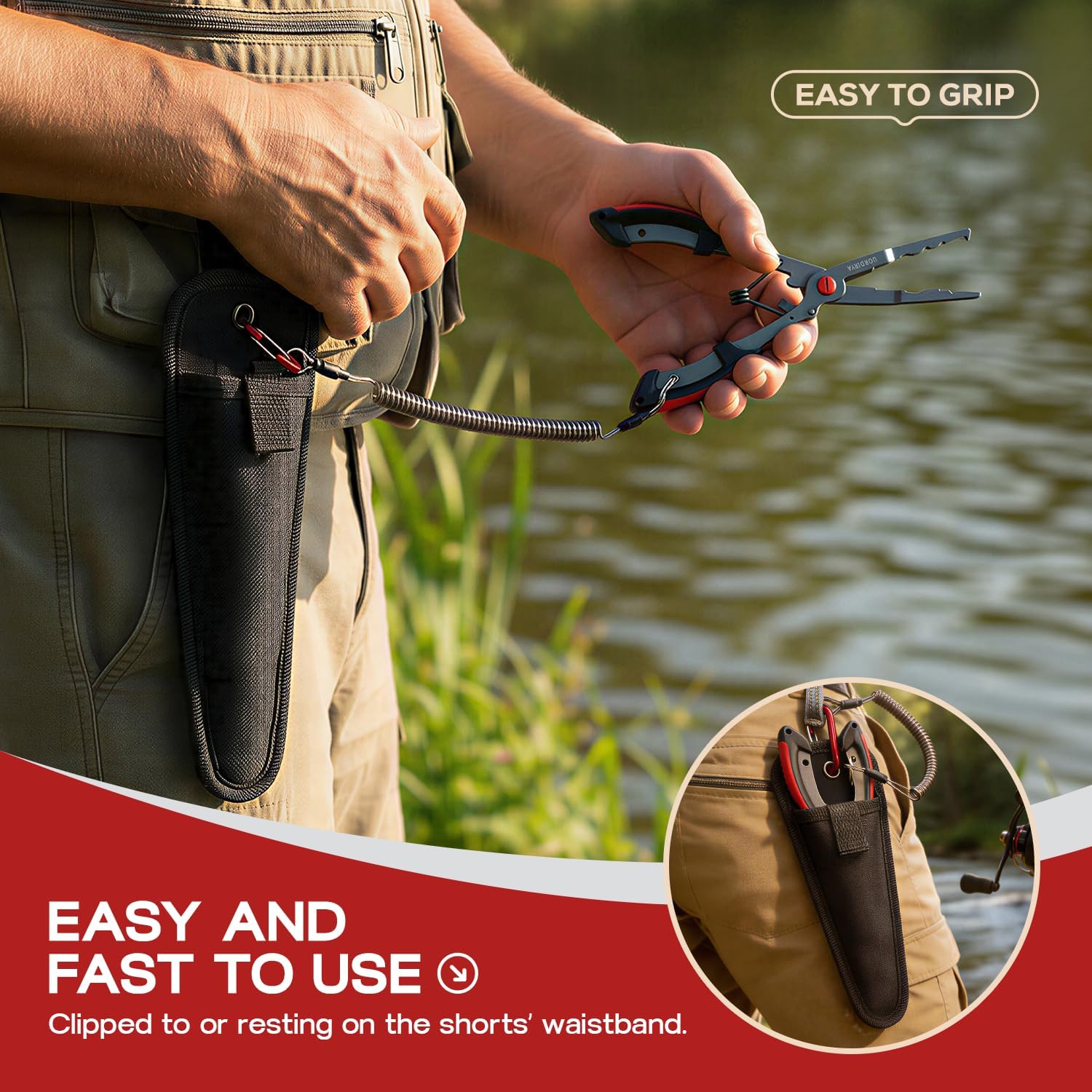 【Perfect for Boat, Kayak & Shore Fishing】Includes a retractable safety lanyard and belt sheath — ideal for fishing from boats, kayaks, piers, or shorelines without worrying about dropping your pliers.