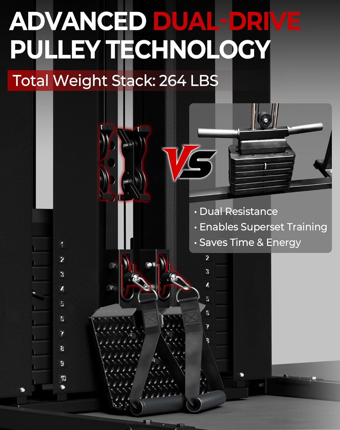 【Innovative Pulley Configuration】 The Mikolo Smith Machine features an innovative pulley configuration that achieves a 2:1 ratio for the functional trainer, internally combining the 2:1 output from each of the two weight stacks to deliver a 264-lb total capacity for lat pulldown and low row. This system enables seamless transitions between lat pulldown, low row, and trolley movements without carabiner adjustments